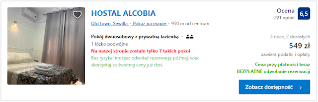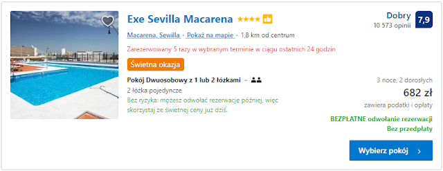 Ze względu na dłuższy pobyt w Sewilli proponujemy dwa obiekty noclegowe w centrum tego miasta. Pierwszy z nich jest HOSTAL ALCOBIA, w którym pobyt w dniach 30 listopad – 3 grudnia kosztować nas będzie 521 zł za pokój jednoosobowy i 549 zł za pokój dwuosobowy. Z kolei koszta trzydniowego pobytu w obiekcie o tanecznej nazwie Exe Sevilla Macarena wynoszą 621 i 682 zł odpowiednio za jedną i dwie osoby.