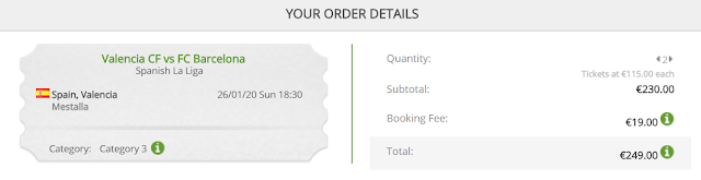 Na oficjalnej stronie Valencii CF nie ma jeszcze otwartej sprzedaży na to spotkanie dlatego zmuszeni jesteśmy skorzystać z rynku wtórnego. Ceny za jeden/dwa bilety rozpoczynają się od 114 EUR (ok. 513 zł)/249 EUR (ok. 1120,50 zł, 560,25 zł os./bilet) REZERWUJ====>.