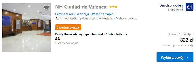 Innym wyborem może być NH Ciudad de Valencia, gdzie koszt trzydniowego noclegu wynosi 949 zł za jedną oraz 822 zł za dwie osoby (137 zł os./noc).