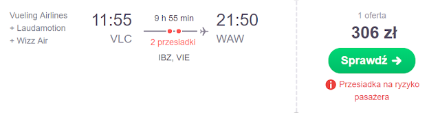 Lot powrotny planujemy na następny dzień – 4 kwietnia. Z Walencji wrócimy do Warszawy Modlin (z przesiadką w Brukseli) za 289 zł REZERWUJ====>, Wrocławia (z przesiadką w Ibizie oraz Alicante) za 306 zł REZERWUJ====> i Warszawy (z przesiadką w Ibizie i Wiedniu) za 306 zł REZERWUJ====>.