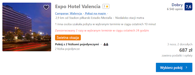 Proponujemy nocleg w terminie 2-5 stycznia w obiektach znajdujących się niedaleko Estadio Mestalla. Pierwszy z nich to oddalony niecałe 3 km od stadionu Expo Hotel Valencia, który oferuje pobyt w pokoju jedno i dwuosobowym kwocie 687 zł (114,5 zł os./noc).