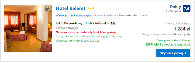 W samej już Walencji możemy zaproponować Hotel Beleret. W tym obiekcie koszta rozkładają się następująco: 1028 zł – 1 osoba, 1074 zł – 2 osoby przy pobycie trzydniowym oraz 1222 zł – 1 osoba i 1284 zł – 2 osoby przy pobycie na cztery dni.
