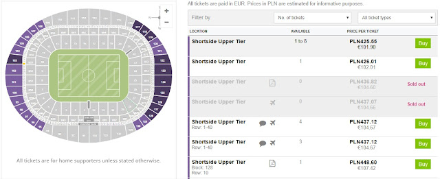 Wejściówki na spotkanie znajdziemy na rynku wtórnym, a najtańsze dostaniemy za około 495 zł. Należy pamiętać, że część z ofert dotyczy dostawy biletów tylko na terenie Anglii, więc warto uprzedzić znajomych lub hotel o nadejściu przesyłki. Uwaga! Nie przechodzimy na polską wersję (Stubhub) a pozostajemy w angielskiej wersji strony (ticketbis.net) – znajdziemy tam zdecydowanie tańsze bilety! REZERWUJ====>
