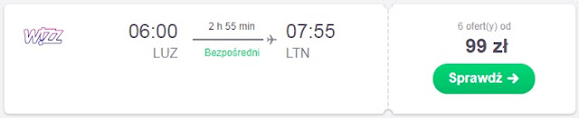 Lot powrotny do Polski planujemy dzień po spotkaniu 16.03. Za transport z lotniska Londyn-Luton do Szczytna zapłacimy 74 zł* (cena regularna 119 zł) REZERWUJ====>. Inne możliwości to lot do Gdańska za 144 zł* (cena regularna 198 zł) REZERWUJ====> lub Lublina za 164 zł* (cena regularna 219 zł) REZERWUJ====>