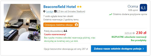 Proponujemy pobyt na jedną noc w dwóch miejscach położonych nieopodal stadionu Kanonierów. Za noc dla dwóch osób w Guest House Brick Lane zapłacimy 164 zł (82 zł/os/noc). Inna opcja to Beaconsfield Hotel, gdzie pokój dla dwóch osób to koszt 230 zł (115 zł/os/noc).