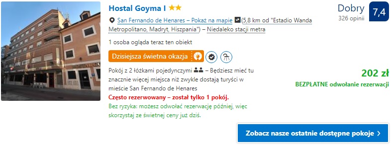 Proponujemy nocleg w Hostal Goyma I położony niedaleko stadionu gdzie za dwie noce w pokoju dwuosobowym zapłacimy 404 zł ( 101 zł os./noc) lub jeden nocleg w tym samym hotelu w pokoju dwuosobowym za 202 zł ( 101 zł os./noc).