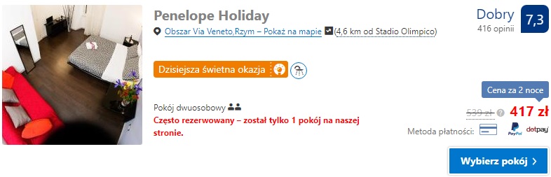 Proponujemy pobyt w Penelope Holiday gdzie za dwie noce w pokoju dwuosobowym zapłacimy ok. 477 zł ( ok. 120 zł os./noc- w cenę wliczyliśmy podatek miejski). W przypadku jednego noclegu proponujemy Roema Guest House gdzie za nocleg dla dwóch osób zapłacimy ok 186 zł ( ok. 93 zł os./noc- w cenę wliczyliśmy podatek miejski).