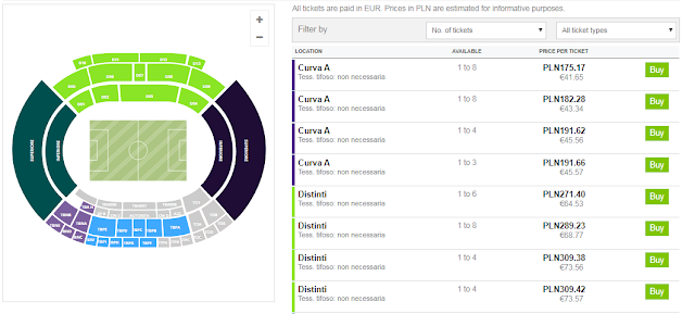 Wejściówki na mecz kupimy na rynku wtórnym, najtańsze pojedyncze bilety można nabyć za około 233 zł. Warto pamiętać, że bilet o ile nie jest elektroniczny może być dostarczony tylko na terenie Włoch, w związku z czym należy uprzedzić hotel o nadejściu przesyłki. Uwaga! Nie przechodzimy na polską wersję (Stubhub) a pozostajemy w angielskiej wersji strony (ticketbis.net) – znajdziemy tam zdecydowanie tańsze bilety! – REZERWUJ====>
