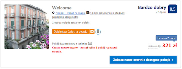 Proponujemy nocleg w Bagnoli Studio gdzie za apartament dla dwóch osób zapłacimy 235 zł za dwie noce (117,5 zł za osobę za dwie noce) lub obiekt Welcome gdzie za pokój dwuosobowy zapłacimy 321 zł (ok. 160 zł za osobę za dwie noce). Warto pamiętać, że w Neapolu obiekty w których nocujemy pobierają podatek miejski w wysokości 2 EUR za osobę za dzień.