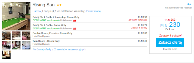 Na jedną noc w Londynie proponujemy poniższe obiekty. Oba znajdują się w promieniu nie większym niż 5 kilometrów od Wembley. Za pokój dwuosobowy zapłacimy 210-230 zł ( 105-115 za osobę za noc)