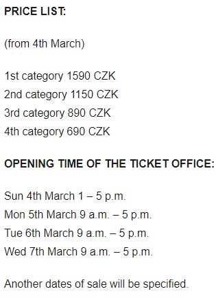 Sprzedaż biletów rozpocznie się 4 marca. Bilety będzie można zakupić online za pomocą strony plzenskavstupenka, a najtańsze bilety zakupimy już od 111 zł. Poniżej prezentujemy okres otwarcia kas stacjonarnych, datę rozpoczęcia sprzedaży oraz ceny w koronach czeskich.