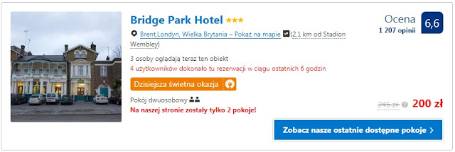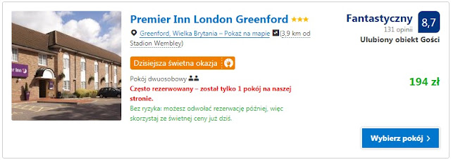 Pobyt na jedną noc proponujemy w dwóch miejscach położonych w okolicach monumentalnego Wembley. Dwie wskazane możliwości to Premier Inn London Greenford za 194 zł (97 zł/os/noc) bądź nieco droższy Bridge Park Hotel za 200 zł (100 zł/os/noc).