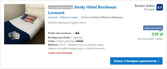 Proponujemy dwie opcje noclegowe na dwie noce dla dwóch osób w okolicach stadionu. Pierwsza z możliwości to Study Hotel Bordeaux Lormont za 339 zł (85 zł/os/noc), a inna opcja na pobyt to Campanile Bordeaux Nord – Le Lac za 470 zł (118 zł/os/noc).