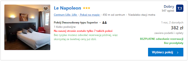 W centrum miasta możemy zasugerować pobyt w hotelu Le Napoleon, w którym pokój jednoosobowy to koszt 311 zł za dobę, a dwuosobowy to 382 zł za dobę.