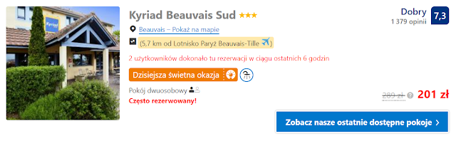 Dla tych, którzy wolą nocować blisko portu lotniczego w Paryżu oferujemy Kyriad Beauvais Sud Hotele. Koszt pobytu wraz z podatkiem miejskim w pokoju dwuosobowym wynosi 208 zł (104 zł os./noc).