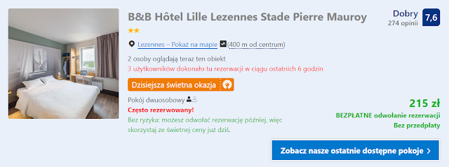 Oferujemy pobyt w B&B Hôtel Lille Lezennes Stade Pierre Mauroy, który jest oddalony od stadionu zespołu Lille o 300 metrów. Koszt noclegu w pokoju dwuosobowym wraz ze śniadaniem i podatkiem miejskim wynosi 224 zł (112 zł os./noc).