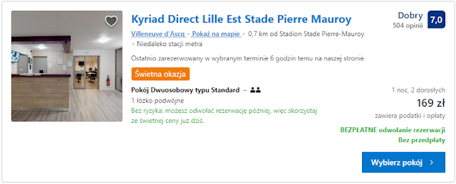 Jedną noc w terminie 26-27 stycznia w okolicach stadionu gospodarzy możemy spędzić w obiekcie Kyriad Direct Lille Est Stade Pierre Mauroy. Za pobyt tutaj zapłacimy 166 zł za osobę lub o 3 złote więcej za dwie osoby.