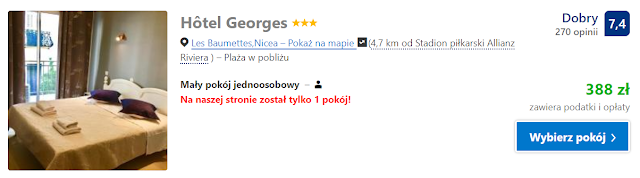 Dla kibiców, którzy na ten mecz wybierają się w pojedynkę polecamy Hôtel Georges. Za nocleg w pokoju jednoosobowym zapłacimy 388 zł.