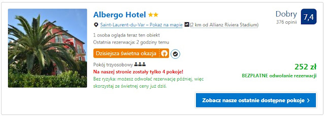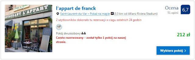 Proponujemy noclegi w dwóch miejscach nieopodal stadionu Nicei. Pierwsza opcja to l’appart de franck za 212 zł za noc dla dwóch osób (106 zł/os/noc). Druga, nieco droższa to Albergo Hotel, w którym zapłacimy 252 zł (126 zł/os/noc).