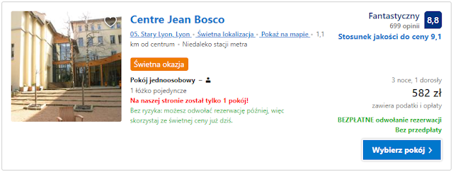 Dla osoby, która chciałaby sama wybrać się na mecz możemy zasugerować jeszcze obiekt Centre Jean Bosco, w którym został już tylko jeden pokój jednoosobowy za 582 zł na trzy doby.