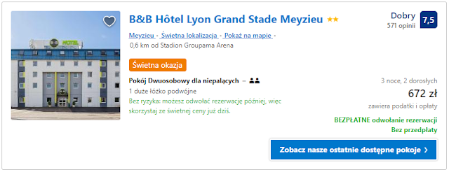 W pierwszej kolejności proponujemy obiekt B&B Hotel Lyon Grand Stade Meyzieu, który znajduje się niecały kilometr od stadionu. Za pobyt dla jednej osoby w dniach 18-21 października zapłacimy 659 zł (ok. 220 zł/osoba/doba), a dla dwóch osób 672 zł (112 zł/osoba/doba).