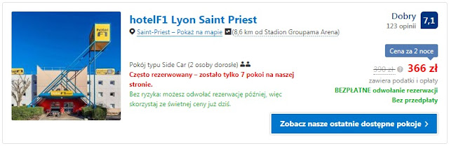 Na dwie noce w Lyonie proponujemy noclegi w dwóch obiektach: hotelF1 Lyon Saint Priest za 366 zł (92 zł/os/noc) lub Hotel 1ere Etape za 463 zł (116 zł/os/noc).