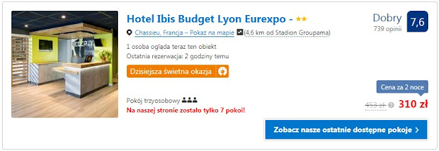Pobyt dotyczy noclegów na dwie noce, stąd też dwie propozycje, które dość nieznacznie odbiegają od siebie cenowo. Pierwsza możliwość to pobyt w hotelF1 Lyon Est Beynost, w którym zapłacimy 240 zł (60 zł/os/noc). Druga z możliwości dotyczy noclegów w Hotel Ibis Budget Lyon Eurexpo za 310 zł (78 zł/os/noc).
