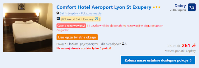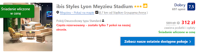 Proponujemy oddalony o niecały kilometr od lotniska w Lyonie Comfort Hotel Aeroport Lyon St Exupery. Tutaj za pokój dwuosobowy zapłacimy 270 zł (135 zł os./noc). Alternatywą może być znajdujący się 700 metrów od Parc OL ibis Styles Lyon Meyzieu Stadium. Koszt pobytu w dniach 3-4 lutego wynosi 311 dla jednej oraz 358 zł (179 zł os./noc) dla dwóch osób. W cenie zawarte jest śniadanie.