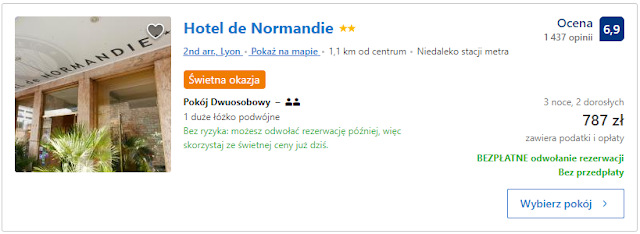 Drugi obiekt zlokalizowany również w okolicy centrum i stacji metra to Hotel de Normandie. W tym miejscu ceny za cały pobyt wzrosną do 724 zł dla 1 osoby i 787 zł dla dwóch osób.