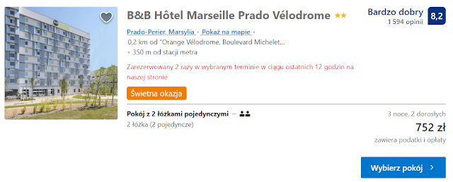 Oferujemy obiekty znajdujące się blisko Orange Velodrome. Pierwszy z nich to B&B Hôtel Marseille Prado Vélodrome, który oferuje nocleg w terminie 6-9 marca w pokoju dwuosobowym za 752 zł (ok. 125,5 zł os./noc).