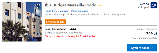 Inną opcją może być Ibis Budget Marseille Prado. Za trzydniowy nocleg w tym obiekcie zapłacimy 781 zł za jedną oraz 709 zł za dwie osoby (177,5 zł os./noc).