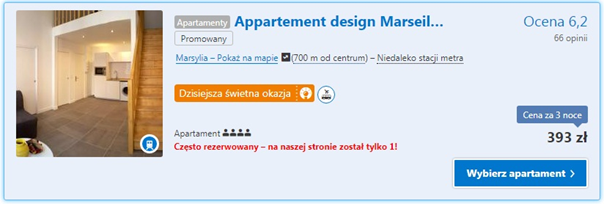 Proponujemy trzy opcje noclegu, w zależności od dostępnych finansów. Położone niedaleko centrum Appartement design Marseille Longchamps & Vieux Port, za który zapłacimy 393 zł w przypadku trzech nocy dla dwóch osób (65,5 zł/os/noc) lub Appartement Design Meuble Marseille Centre Longchamp za 427 zł (71,5 zł/os/noc). Inną opcją jest położony nieopodal Velodrome – Camille Flammarion za 504 zł (84 zł/os/noc).