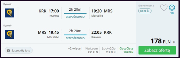 Proponujemy skorzystać z wylotu do Marsylii z Krakowa dwa dni przed meczem 8 grudnia. Powrót planujemy dzień po spotkaniu 11 grudnia do Krakowa. Za bilet w obie strony zapłacimy już od 178 zł. REZERWUJ====>
