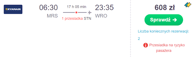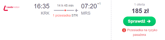 Doradzamy wylot z Marsylii do Krakowa (z przesiadką w Stuttgarcie) w dniu 23 maja. Za to połączenie zapłacimy 185 zł REZERWUJ====>.