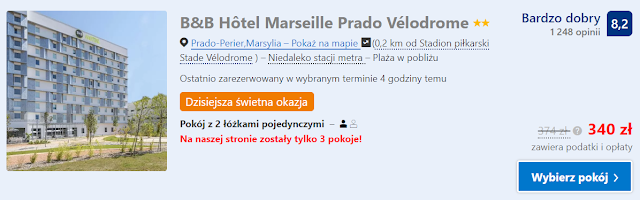 200 metrów do Stade Velodrome będziemy mieli w przypadku wyboru B&B Hôtel Marseille Prado Vélodrome. Za jednodniowy nocleg dla jednej i dwóch osób zapłacimy 344 zł* (172 zł os./noc).