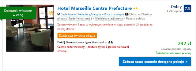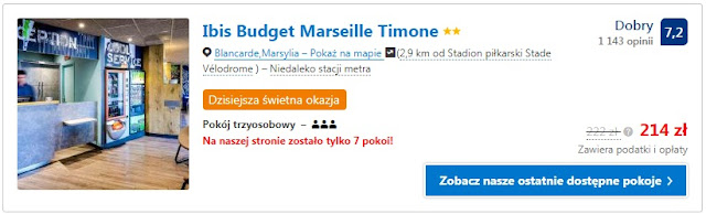 Proponujemy dwie opcje noclegowe w okolicach stadionu Olympique Marsylia. Pierwsza z opcji to ibis Budget Marseille Timone za 214 zł (107 zł/os/noc). Inna możliwość to pobyt w Hotel Marseille Centre Prefecture za 232 zł (116 zł/os/noc).