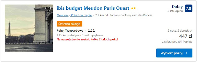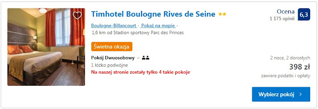 Oferujemy dwie opcje noclegowe na pobyt w Paryżu, oba obiekty znajdują się nieopodal Parc des Princes. Pierwsza z nich to Timhotel Boulogne Rives de Seine za 398 zł (100 zł/os/doba). Inna możliwość to nocleg w ibis budget Meudon Paris Ouest za 447 zł (112 zł/os/doba).