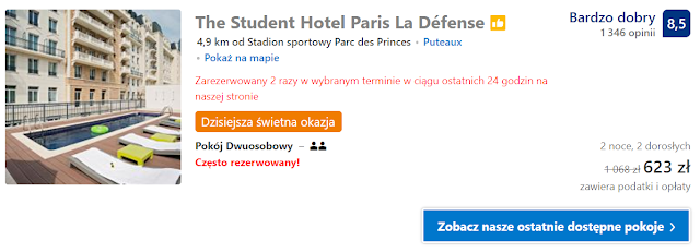 Nieopodal wymienionego obiektu znajduje się The Student Hotel Paris La Défense, w którym za nocleg w pokoju dwuosobowym zapłacimy 631 zł* (ok. 158 zł os./noc).
