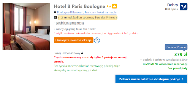 Dla udających się do Paryża dzień wcześniej oferujemy Hotel B Paris Boulogne. Pobyt w dniach 15-17 grudnia kosztuje 387,5 zł za pokój jednoosobowy oraz 550 zł za dwuosobowy (137,5 zł os./noc).