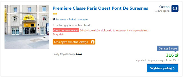 Proponujemy pobyt na dwie noce dla dwóch osób w takich obiektach jak: Premiere Classe Paris Ouest Pont De Suresnes za 316 zł (79 zł/os/noc) oraz hotelF1 Paris Porte de Chatillon za 391 zł (98 zł/os/noc).