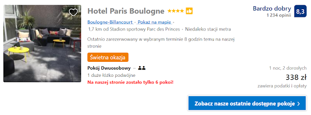 Kibice przylatujący do Paryża dzień wcześniej oferujemy oddalony o kilometr od stadionu Mercure Paris Boulogne. Za pobyt w terminie 26-28 października zapłacimy 1035 zł za jedną oraz 944 zł za dwie osoby (236 zł os./noc).