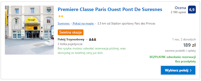 W pierwszej kolejność proponujemy obiekt Premiere Classe Paris Ouest Pont De Suresnes, który dostępny będzie w terminie 21-24 listopada w każdej z możliwych kombinacji noclegów. Za jedną noc z 22 na 23 listopada zapłacimy 184 zł za osobę lub 189 zł za dwie osoby. Cena kolejnych noclegów wzrasta proporcjonalnie do tych kwot, tak więc za dwie doby zapłacilibyśmy około 380 zł, a za trzy około 570 zł.