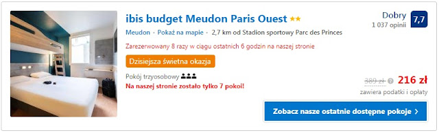 Proponujemy dwie opcje noclegowe na jedną noc dla dwóch osób: ibis budget Meudon Paris Ouest za 216 zł (108 zł/os/noc) oraz Hotel De France 266 zł (133 zł/os/noc).