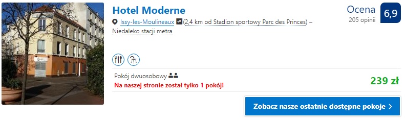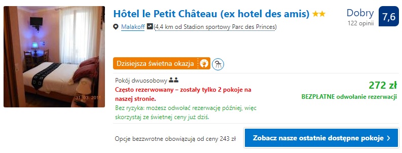 W przypadku dwóch noclegów proponujemy zatrzymać się w Hôtel le Petit Château lub Hotel Moderne. W pierwszym za dwie noce w pokoju dwuosobowym zapłacimy 544 zł (136 zł os./noc) natomiast w drugim 477 zł ( ok. 120 zł os./noc). W przypadku jednego noclegu możemy skorzystać z tych samych lokalizacji w pokoju dwuosobowym w Hôtel le Petit Château za 272 zł ( 136 zł os./noc) lub w Hotel Moderne za 239 zł (ok. 120 zł za osobę).