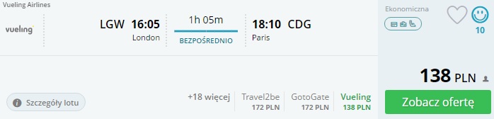 Proponujemy lot łączony do Paryża przez Londyn dzień przed meczem. Do Londynu dolecimy z Warszawy za 56 zł REZERWUJ ==== >, z Poznania za 83 zł REZERWUJ ==== >, z Gdańska do Londynu za 43 zł* (cena regularna 89 zł) REZERWUJ ==== >. Z Londynu do Paryża, tego samego dnia dolecimy za 138 zł REZERWUJ==== >.