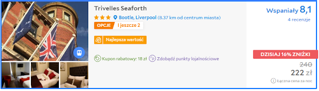 Propozycja nie wymaga noclegu jeśli jednak zdecydujemy się na opcje z noclegiem to polecamy bardzo komfortowe obiekty w niskiej cenie a w dodatku niedaleko stadionu Anfield. Homestay in Bootle near Hugh Baird College za 165 zł za noc (ok. 83 zł za osobę) lub Trivelles Seaforth za 222 zł za noc (ok. 111 zł za osobę).