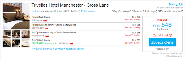 Proponujemy nocleg w Trivelles Hotel Manchester koszt zakwaterowania za 2 doby to 546 zł ( ok. 137 zł za osobę za dobę).
