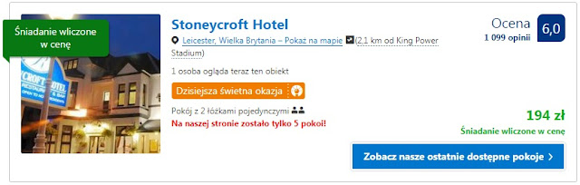 Proponujemy dwie opcje noclegowe nieopodal King Power Stadium w Leicester. Pierwsza opcja to Stoneycroft Hotel za 194 zł dla dwóch osób na noc (97 zł/os/noc). Inna, droższa możliwość to pobyt w South Fork Guest House, gdzie za podobny pobyt zapłacimy 223 zł (112 zł/os/noc).