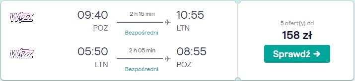 Proponujemy bezpośrednie loty w obie strony w dniach 27-28.03, z portem Londyn Luton istnieje wówczas połączenie z Gdańskiem za 88 zł* (cena regularna 165 zł) REZERWUJ====>, Poznaniem za 88 zł* (cena regularna 158 zł) REZERWUJ====> oraz Warszawą za 128 zł* (cena regularna 238 zł) REZERWUJ====>