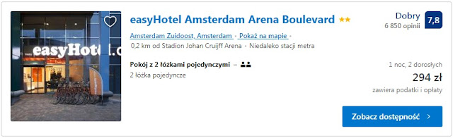 Tradycyjnie proponujemy dwie opcje noclegowe nieopodal stadionu. Pierwsza z nich to Hotel Flipper Amsterdam za 247 zł (124 zł/os/doba). Nieco droższa opcja, bliżej stadionu to easyHotel Amsterdam Arena Boulevard za 294 zł (147 zł/os/doba).